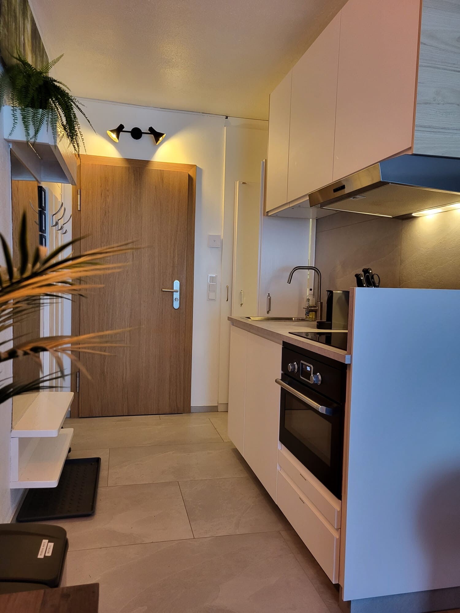 The apartment is modernly furnished and has a cosy atmosphere. There is a high dining table with four stools and a two-seater sofa with two moveable tables. The bar stools can be lowered, so that you can also put them next to the sofa.
