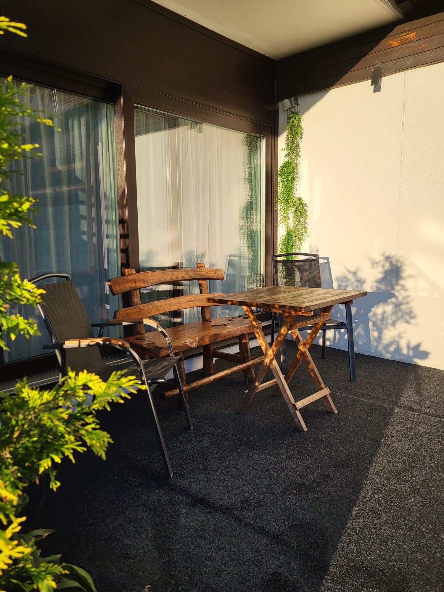 Because the apartment is on the ground floor, there is a cosy terrace right outside. On the terrace there is a table, a double bench and two separate chairs. From the terrace you can enjoy the sunrise in the morning with a fresh cup of coffee. In the mirror cabinet you will find bear rugs and cushions, which you can lay down on the garden furniture to make yourself more comfortable.